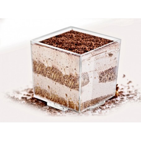 Simpatica coppetta mini a forma di cubo. Ideale per mousse, aperitivi e buffet e realizzata in plastica trasparente.
